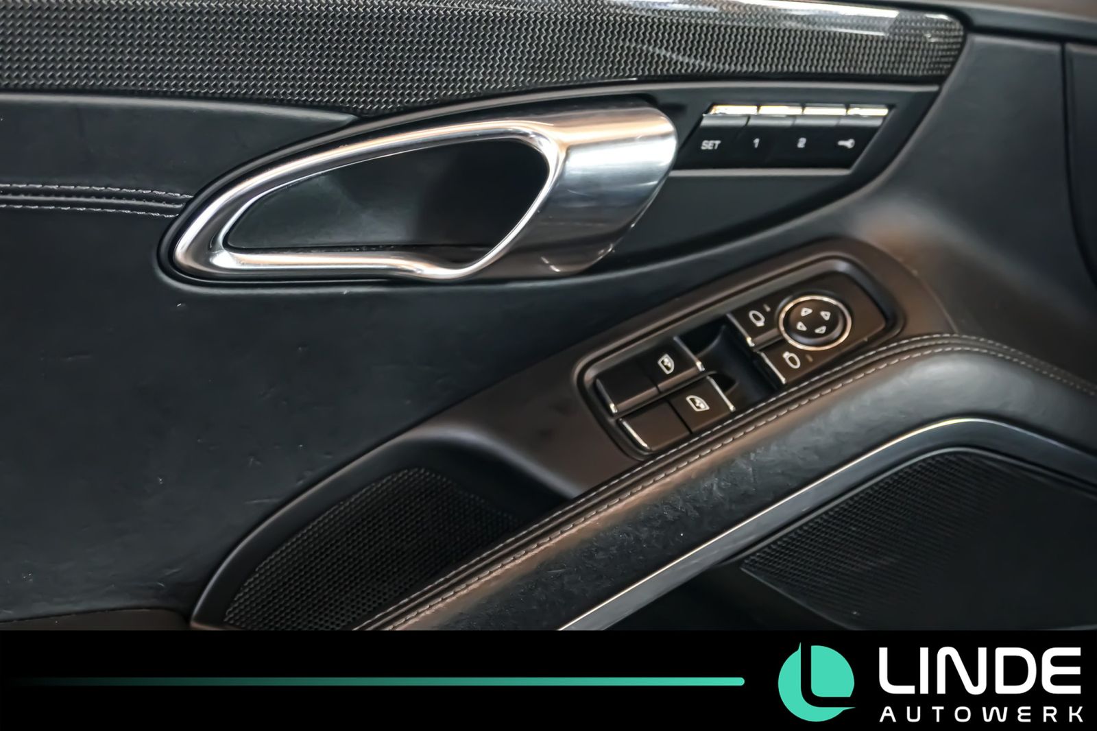 Deutsche Ausführung, HU / AU ( Juli / 2027 ), 21€ Aluminiumfelgen / Sommerreifen  ( TechART ), Sportauspuff ( TechART ), Adaptive Sportsitze inkl. Sitzverstellung 18-Wege und Memory-Paket, Außen-/Innenspiegel mit Abblendautomatik und Regensensor, Außenspiegel Sport Design, Blende Gurtaustritt B-Säule Alcantara, Einstiegsblenden (Carbon) beleuchtet, Fahrassistenz-System: Park-Assistent vorn und hinten inkl. Rückfahrkamera, Fahrassistenz-System: Spurwechselassistent, Fahrassistenz-System: Verkehrszeichenerkennung, Frontscheibe mit Bandfilter oben, Fußmatten, Geschwindigkeits-Regelanlage (Tempomat), Hauptscheinwerfer LED, schwarz, inkl. Porsche Dynamic Light System Plus (PDLS+), Home-Link (Garagentoröffner), Innenraumlicht-Paket / Licht-Design-Paket, Interieur-Paket: Carbon, Kopfstützen vorn mit Porschewappen, Porsche Torque Vectoring Plus (PTV Plus), Radioempfang digital (DAB+), Raucher-Paket, Scheinwerfer-Reinigungsanlage, Abdeckung lackiert, Schiebedach elektrisch (Glas), Schwellerabdeckung / -verkleidung Wagenfarbe, Servolenkung Plus (geschwindigkeitsabhängig), Sitzbezug / Polsterung: Leder / Alcantara, Sitzheizung vorn, Sonnenblenden Alcantara, Sound-System BOSE, Sport-Auspuffanlage, Sport-Chrono-Paket, Sportsitze Plus