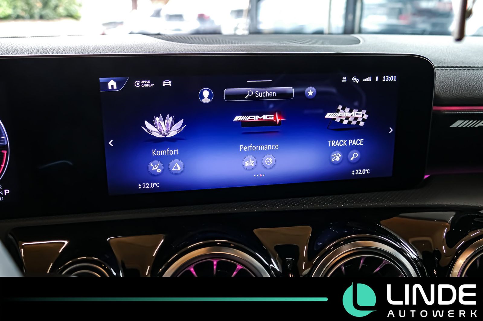 Airbag Beifahrerseite abschaltbar, Airbag Fahrer-/Beifahrerseite, Ambiente-Beleuchtung, AMG Driver's Package, Anti-Blockier-System (ABS), Beckenairbag vorn (Pelvisbag), DAB-Tuner (Radioempfang digital), Design- und Ausstattungslinie Standard, Direktlenkung mit variabler Lenkkraft-Unterstützung, Display-Paket, Edelstahlpedale Sportdesign, Elektron. Stabilitäts-Programm (ESP), Fahrassistenz-System: Agility Select / Dynamic Select (Fahrmodusschalter), Fahrassistenz-System: aktiver Bremsassistent, Fahrassistenz-System: aktiver Spurhalteassistent, Fahrzeug Setup (Onlinedienste / Apps), Fahrzeug-Monitoring (Fahrzeugortungssystem), Fensterheber elektrisch vorn + hinten, Fußmatten AMG, Getriebe 8-Gang